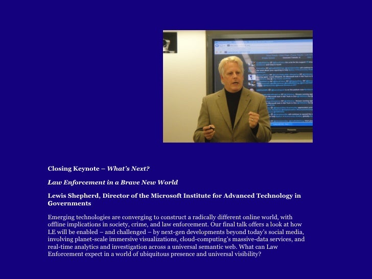 2010 April: Social Media in Law Enforcement Conference, closing keynote "Law Enforcement in a Brave New World" (article)
